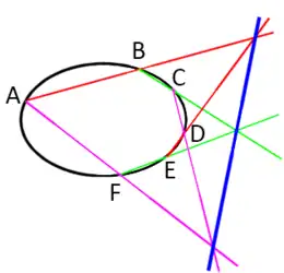- Stel dat een veelhoek met zijden is ingeschreven in een kegelsnede en paren van tegenoverstaande zijden worden verlengd tot zij elkaar snijden in punten, dan zal, als van die punten op één lijn liggen, het laatste punt ook op die lijn liggen.