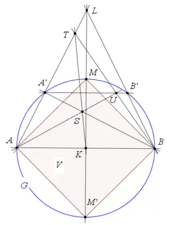 Gegeven zijn een cirkel G met middelpunt K. Te construeren: een vierkant, alleen met ongemerkte liniaal.