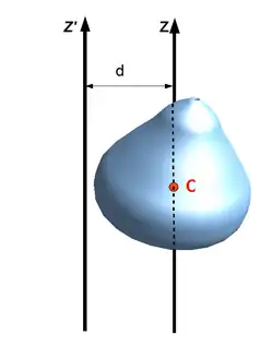 - de afstand van het massacentrum tot de beschouwde as dus de afstand tussen beide assen.