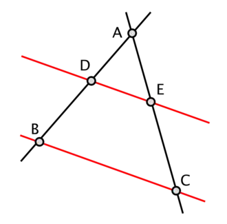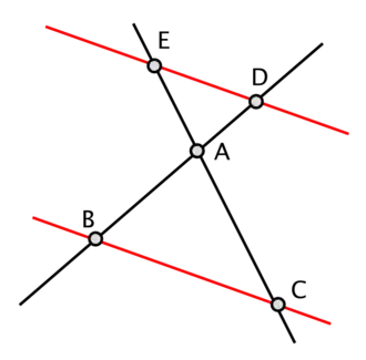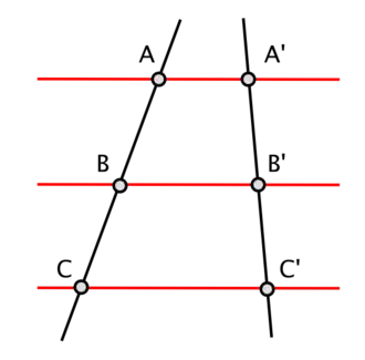 Als drie evenwijdige lijnen twee andere lijnen en snijden, lijn in de punten A, B en C, en lijn in A', B' en C', waarbij A en A' op de ene, B en B' op de tweede en C en C' op de derde van de evenwijdige lijnen liggen, dan is: