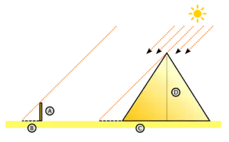 De lengte van de schaduw van de piramide kon hij berekenen. Hij merkte op dat de zonnestralen twee keer op een dag loodrecht op een zijde van de piramide stonden. Het volstond dus de lengte van de schaduw tot de voet van de piramide te meten en daar de helft van de lengte van een zijde bij te tellen.