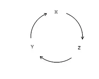 Een cykel verschilt van een verzameling doordat de volgorde van de elementen erin wel van belang is (waarbij men zich moet voorstellen dat de elementen in een kring zijn geplaatst). In de figuur hiernaast is (XZY) een cykel; (ZYX) en (YXZ) zijn dezelfde cykel, maar (XYZ, (YZX) en (ZXY) vormen een andere cykel. Drie elementen kunnen dus op twee manieren een cykel vormen; twee elementen of één element slechts op 1 manier.