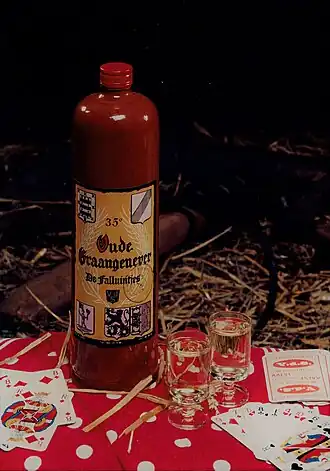 Een typerende kruik (of stoop) Faluintjesjenever van uit 1986. Centraal onderaan het etiket is nog de oude stempel van VdS te zien dat ook als logo gebruikt werd.