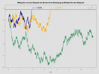 Definieer als het kleinste tijdstip waarop de absolute waarde van het proces de waarde 10 overschrijdt: We spreken af dat het minimum van de lege verzameling oneindig bedraagt.
