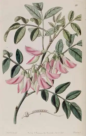 Het was een groenblijvende liaan met oneven geveerde bladeren die bestonden uit vijf tot zeven deelblaadjes. De deelblaadjes waren elliptisch, 2,5–4 cm lang en 1–2 cm breed De bloeiwijzen bestonden uit bladokselstandige, 3–6 cm lange trossen met vijf tot acht roze bloemen. De schutblaadjes waren driehoekig, 1 mm lang en vielen snel af. De bloemstelen van de individuele bloemen waren circa 5 mm lang. De bloemen waren spiegelsymmetrisch en hadden de vorm van een papegaaiensnavel. De bloemkelk was klokvormig met driehoekige, 1–2 mm lange tandjes. De bloembladeren waren 2-2,5 cm lang met 1,5–2 cm lange vleugels en een 2-2,5 cm lange, gekromde kiel. De plant vormde 4-4,5 cm lange, gladde, aan de zijkant afgeplatte peulen met daarin circa 1 cm lange zaden.