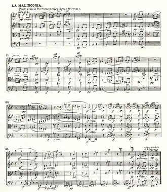 Het meest opmerkelijk is ongetwijfeld het langste deel, het slotdeel: La Malinconia. Dit is een inleidend adagio van een harmonisch onontwarbare complexiteit wat qua duister broeiende sfeer volledig contrasteert met een opgewekt en lichtvoetig Allegretto wat zonder enige overgang er naast geplaatst lijkt. Dit contrast tussen Allegro en Adagio lijkt het belangrijkste effect wat het geheel draagt. Men treft dit effect ook aan bij het strijkkwartet nr 13.