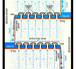 Destillatiekolommen bestaan uit een verticale kolom met vloeistof die van de bovenkant naar de bodem stroomt. De damp gaat onderaan de kolom binnen en verlaat de kolom langs de bovenzijde. Binnen de kolom bevinden zich de schotels. Die dwingen de vloeistof om afwisselend horizontaal te stromen terwijl de damp omhoog borrelt door gaten in de schotels. Het doel van de schotels bestaat, om het contactoppervlak tussen de vloeistof en damp te verhogen.