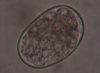 | Eitje van Ancylostoma caninum, een soort mijnworm die bij honden voorkomt | |||||||||