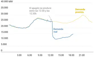 De zon scheen fel en om 12.30 uur produceerde Spanje 19,5 GW zonne-energie. Daardoor produceerde Spanje meer elektriciteit: 32 GW dan er vraag was: 25 GW. Spanje voerde al zoveel uit naar Frankrijk: 0,87 GW, naar Marokko: 0,78 GW en naar Portugal: 2,6 GW als de hoogspanningskabels toelieten. De hydroelektrische pompcentrale nam ook zoveel af als ze kon: 3 GW. De prijs van elektriciteit werd door het onevenwicht van vraag en aanbod negatief: producenten van elektriciteit moesten geld betalen om elektriciteit op het stroomnet te zetten. Producenten schakelden daardoor in 5 seconden af van het stroomnet. Ook de kerncentrales van 3,3 GW stopten. Omdat het Spaanse net niet langer synchroon liep, schakelden Frankrijk en Marokko hun verbinding af. Daarna viel het stroomnet uit en omdat er geen synchroon net meer werkte, konden de producenten van elektriciteit niet opnieuw aanschakelen op het synchroon net.