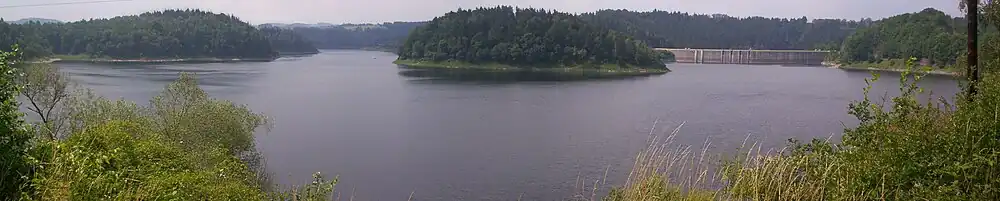 De dam werd gebouwd in de jaren 1902-1912 in de rivier de Bóbr met een hoogte van 62 m en een lengte van 290 m waardoor een stuwmeer is ontstaan met een lengte van 7 km, een oppervlakte van 240 hectare, een gemiddelde diepte van ca. 40 meter en een capaciteit van 50 miljoen m³ water. Rondom het meer is een wandelgebied aangelegd.