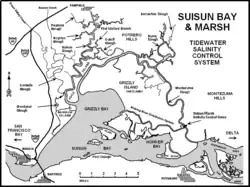 Kaart van Suisun Bay en het gelijknamige moeras ten noorden ervan.