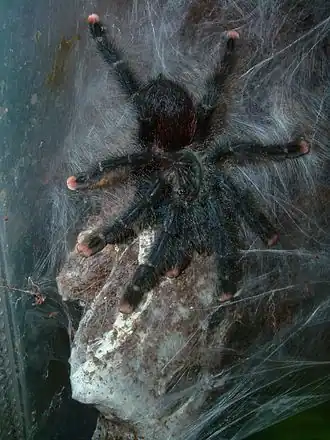 | Een mannelijk exemplaar van de Avicularia metallica in zijn web. | |||||||||||||||