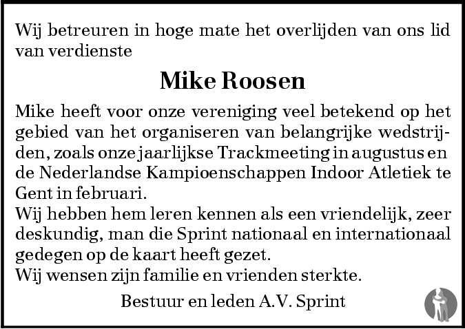- ↑ Overlijdensbericht van Mike Roosen. AV Sprint, Breda (5 februari 2007) – via Mensenlinq.nl.
