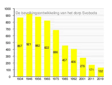 Het dorp Svoboda heeft te kampen met een intensieve bevolkingskrimp. Het aantal inwoners daalde van een maximum van 921 personen in 1946 naar een minimum van 132 personen in 2019.[1]