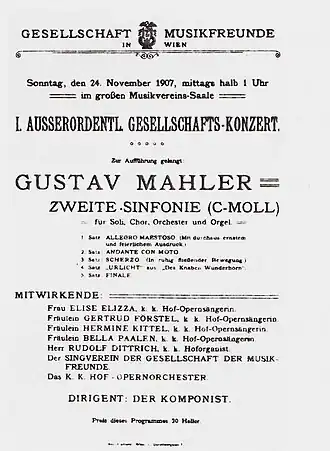 Gustav Mahler heeft lang geworsteld met zijn tweede symfonie. Aan het begin ervan ligt een aparte compositie, zijn symfonisch gedicht "Totenfeier" (1888), ten grondslag. Na 'montage' van deze aparte orkestcompositie in het compositieproject van zijn Tweede, werd het geheel pas in juni 1894 afgerond. Op 13 december 1894 vond in Berlijn de eerste uitvoering plaats.