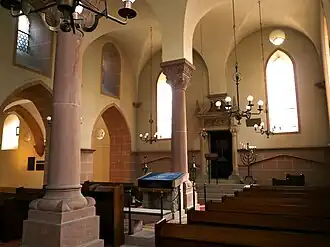 De synagoge voor mannen is een tweebeukige zaalbouw, die door twee romaanse zuilen wordt gedragen. In het midden van de zaal tussen de zuilen bevindt zich een moderne bima, aan de oostelijke muur ligt de deels in renaissance stijl uitgevoerde thoraschrijn, die in de jaren 1704-1705 een barokke bewerking kreeg.