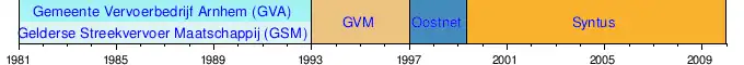 Tijdlijn rechtsvoorgangers. De tijdlijn loopt tot 2010 omdat Syntus dat jaar de concessie Achterhoek verloor aan Arriva.