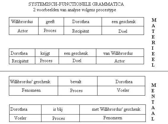 Op dezelfde wijze wordt binnen zinsdelen omgesprongen met de functionele karakteristieken van de delen onder beschouwing; werkwoorden, de spil van de zin, worden onderverdeeld naargelang van hun semantische import, en niet zonder meer 'persoonsvorm' genoemd. Men neme bijvoorbeeld een traditionele zinsontleding met een werkwoord als 'roepen':