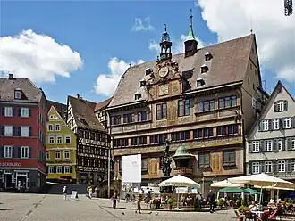 - Marktplatz met stadhuis (1435), verbouwd 16de eeuw en 1689, met beschilderde façade (1876) en astronomisch uurwerk (1511)