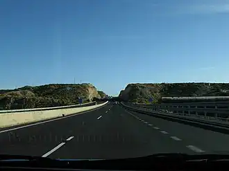 Hier gaat de snelweg over in een driebaansweg. De afritten zijn hier niet meer genummerd.