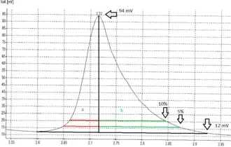 Hierbij zijn a en b de halfbreedtes op een piekhoogte van 5%. Ook de asymmetriefactor wordt vaak gebruikt: