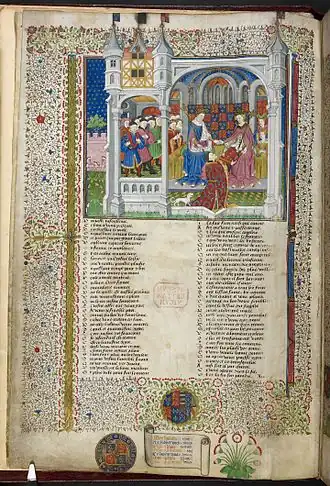 - Rouen, Bibliothèque municipale de Rouen, Ms.927. Frontispice van een manuscript met de Franse vertaling door Nicole Oresme van de Politika van Aristoteles, met andere teksten verlucht door Loyset Liédet, voor het schepencollege van Rouen omstreeks 1452-1454.[11]