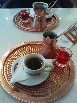 - Griekse koffie, een sterke koffie met drab onder in het kopje, welke komt in drie varianten, waaruit de keuze bij bestelling aangegeven dient te worden: