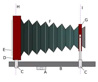 Deze staanders worden verbonden met een balg. Door de beeldvlak-staander te verplaatsen over de balk of bankstuk kan men scherpstellen.
