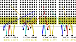 Bij grotere telefooncentrales (meer dan 15 000 abonnees) is dit systeem niet meer werkbaar. De panelen worden te groot en de telefonistes krijgen het te druk. Er zijn meer telefonistes nodig. Er zijn bijvoorbeeld twaalf telefonistes en 45 000 abonnees. Elke telefoniste heeft op haar paneel 15 000 klinken voor uitgaande gesprekken en 3750 klinken voor inkomende gesprekken. De afbeelding toont een derde deel van deze centrale (er zijn in werkelijkheid veel meer klinken dan de afbeelding toont) met de panelen van vier telefonistes. Elke abonnee is verbonden met de inkomende klink van zijn eigen telefoniste (op een geel paneel onder) en met de uitgaande klink van vier telefonistes (op een wit paneel boven). Een telefoniste kan een verbinding tot stand brengen tussen een inkomende klink van haar eigen paneel en een uitgaande klink van haar eigen paneel of van het paneel van haar collega's links en rechts. Nu kan een telefoniste niet direct zien of een aansluiting bezet is, maar hiervoor is een eenvoudige oplossing: de telefoniste tikt even met de tip van de stop tegen de ring van een klink. Hoort ze dan een klikgeluid, dan weet ze dat de aansluiting bezet is.