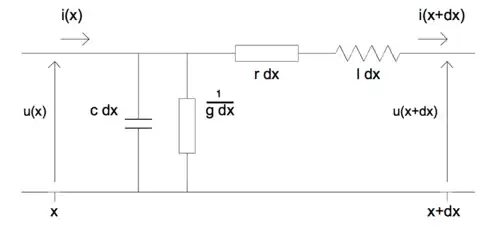 de gedistribueerde lijnparameters. Deze stellen respectievelijk per lengte-eenheid de capaciteit, de inductie, de weerstand en de geleiding tussen de beide geleiders voor.
