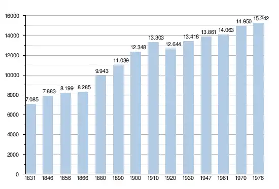 - Bronnen:NIS, Opm:1831 tot en met 1981=volkstellingen; 1990 en later= inwonertal op 1 januari