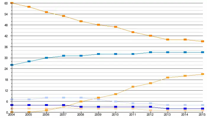 Ontwikkeling in marktaandelen van tennisbanen in Nederland in 2004-2015