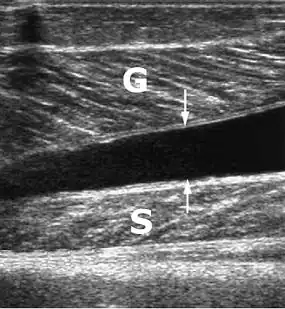 Vochtcollectie tussen musculus gastrocnemius en musculus soleus