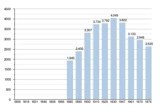 - Bronnen:NIS, Opm:1806 tot en met 1970=volkstellingen; 1976 = inwoneraantal op 31 december
