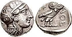 hoofd van Athena met een Attische helm met een kam versierd met drie olijfbladeren in het vizier en een spiraalvormig palmet (voorzijde) en uil van Athene met een olijftakje en maansikkel achter zich en het opschrift ΑΘΕ in een oppervlakkig incuse vierkant (keerzijde). |