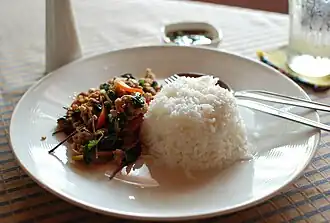 - Kraphao moe raad khao: Met sojasaus, knoflook, chilipepers en Thais basilicum (bai kraphao: Ocimum tenuiflorum) gebakken varkensgehakt geserveerd met/op witte rijst. Wanneer hieraan khai dao wordt toegevoegd, betekent het dat er een gebakken ei bij wordt geserveerd.