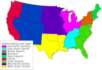 In de voorbeeldkaart zijn staten die bij elkaar horen, regio's, met één kleur weergegeven. De kleuren mogen niet volgordelijk zijn, omdat de gebieden gelijkwaardig worden geacht. NB: Er zijn veel kleuren; de regio's labelen in de kaart was een goede toevoeging geweest.