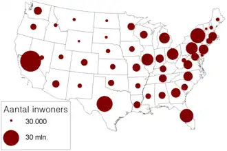 In de voorbeeldkaart worden dezelfde gegevens weergegeven als bij de stippenkaart. Echter, nu zijn de stippen de opgetelde versie van één gebied (in dit geval: één staat). Gevaar is het samensmelten van de stippen, waardoor nog meer informatie dan bedoeld verloren gaat.