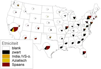 In de voorbeeldkaart rechts is etniciteit weergegeven bij middel van taartdiagrammen. Gebruikelijk en het zuiverst is om de grootte van 'elke taart' per gebied af te laten hangen van de aantallen per gebied, zoals ook hier het geval is. Daardoor wordt de 'ernst' van een hoog of laag percentage extra duidelijk, omdat de grootte van de taartpunt dus ook aantallen weergeeft. Er wordt zo wel (te) veel informatie gelijktijdig weergegeven; de lezer kan andere conclusies gaan trekken dan de auteur wellicht had willen vertellen. De kaart is om nog een andere reden ver van perfect: op deze schaal zijn niet alle gegevens goed te zien, zoals in het noordoosten. Er had beter gekozen kunnen worden voor vijf afzonderlijke, kleine choropleten naast elkaar, dus één kaart per entniciteit als percentage van de bevolking per staat.