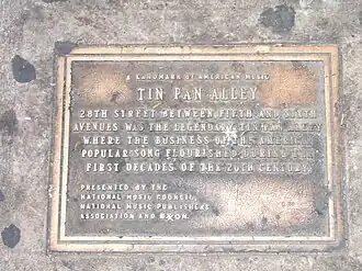 Het gebied tussen Fifth en Sixth Avenue wordt vaak als locatie van Tin Pan Alley gezien. De oorsprong van de naam Tin Pan Alley is niet helemaal duidelijk. Een veel gehoorde theorie is dat op drukke dagen men talloze piano’s van de vele muziekproducenten tegelijk kon horen, die een kakofonie veroorzaakten gelijk aan het slaan op een blikken pan (tin pan). Deze naam werd eerst gegeven aan de locatie van de kantoren en winkels van deze muziekproducers, maar werd later overgenomen door de muziekindustrie.