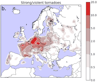Het gebied waar relatief veel tornado's voorkomen strekt zich uit van het zuidwesten van Frankrijk tot het noordoosten van Duitsland. Het gebied ligt naast Frankrijk en Duitsland eveneens in Zwitserland, Luxemburg, België en Nederland.[1]