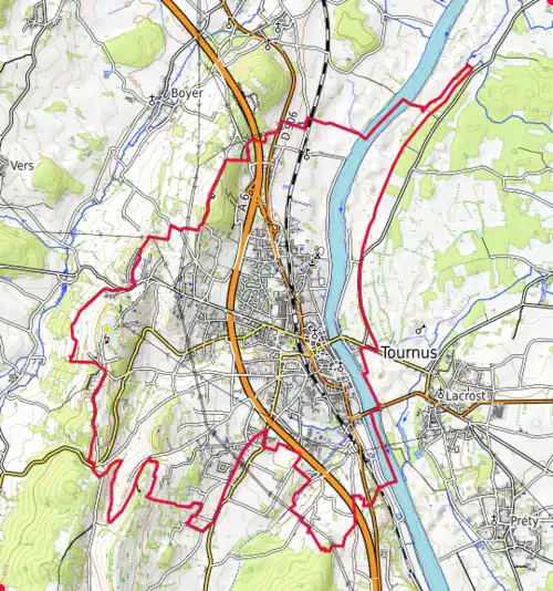 De onderstaande kaart toont de ligging van Tournus met de belangrijkste infrastructuur en aangrenzende gemeenten.