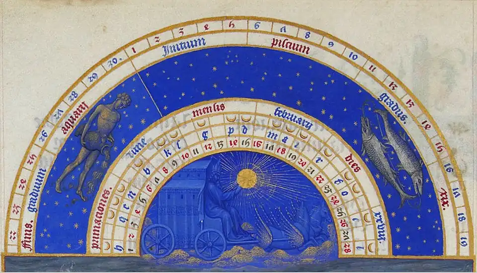 Elke illustratie in de kalender wordt bekroond door een hemelboog met in het centrum een 'zonnewagen' een afbeelding van de god Helios[30] die met zijn vurige wagen dagelijks de zon langs de hemel voerde. De zonnewagen is gebaseerd op een medaille uit de collectie van Jean de Berry, die de intocht van keizer Heraclius in Jeruzalem afbeeldde.[31] Rond die zonnewagen komen in een eerste boog de nummers van de dagen van de maand. In de boog daarboven zien we bij bepaalde dagen een letter tussen ‘a’ en ‘t’ met daarboven een gouden maansikkel. In de buitenste boog van deze tabel vinden we de tekst primationes lune mensis february dies xxviii (voor de andere kalenderminiaturen uiteraard met de naam van de maand en het aantal dagen van de betrokken maand). Deze tabel herneemt in feite het nieuwe gouden nummer,[32] maar de nummers van 1 tot 19 zijn vervangen door de letters a-t (de ‘j’ bestond niet in de middeleeuwen). De tabel in boogvorm stelde de lezer dus in staat om te bepalen op welke dag van de maand de nieuwe maan moest verschijnen in functie van het gecorrigeerde gouden nummer[33] van het jaar. Het enige kerkelijke aspekt van deze tabel is dat ze kon gebruikt worden voor het berekenen van de paasdatum die afhankelijk is van de maanstand. Pasen wordt in principe gevierd op de eerste zondag na de eerste volle maan in de lente (om exact te zijn na 21 maart).