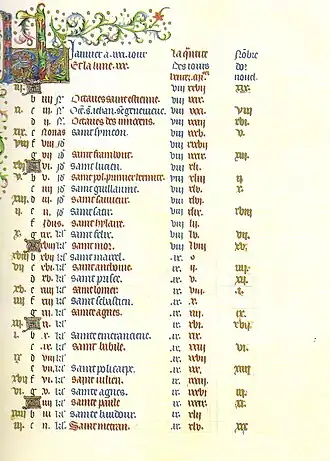 - ↑ a b Het nieuwe gouden nummer heeft dezelfde betekenis als het gouden nummer, maar het houdt rekening met het verschil van drie dagen dat in 1410 bestond tussen de kalender en de reële maanstanden. De kalender was gebaseerd op de Juliaanse kalender waardoor een fout ontstond van één dag per 310 jaar. Dit werd later gecorrigeerd met de Gregoriaanse kalender.