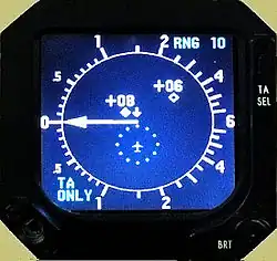 - (Stemgeluid) "Traffic. Traffic." Op het TCAS beeldscherm (verschillend per toestel) wordt het conflicterend toestel geel weergegeven.