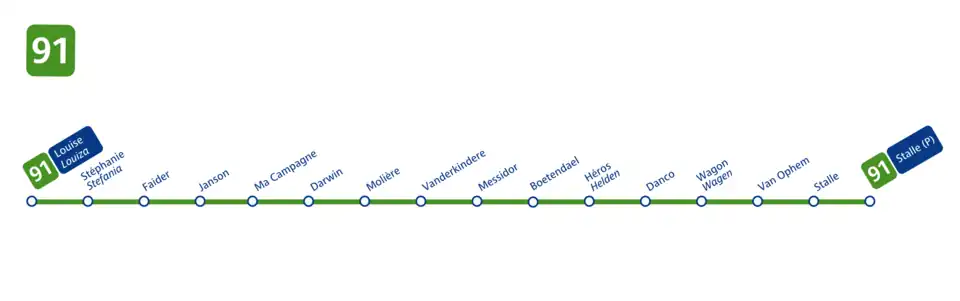De Brusselse tramlijn 91 uitgebaat door de MIVB, verbond het metrostation Louiza met de halte Stalle (P) in Ukkel. Haar kenkleur was donkergroen.