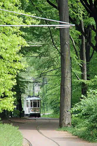 Rotterdamse tram onderweg in het Openluchtmuseum.