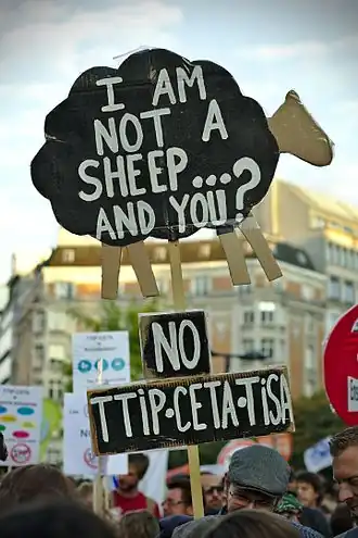 In verschillende Europese landen werden betogingen georganiseerd tegen het TTIP-vrijhandelsakkoord. Op 20 september 2016 werd in Brussel een 'Stop TTIP & CETA Day' gehouden[40] waaraan 10 000 à 15 000 deelnamen. Ook in grootsteden zoals Parijs, Berlijn en Barcelona voerde men reeds actie.[41]