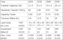 Hoofdindicatoren van de totale EU-MENA HVDC-interconnectie Concentrating Zonnewarmte (CSP) centrales van 2020 – 2050 volgens het TRANS-CSP-scenario