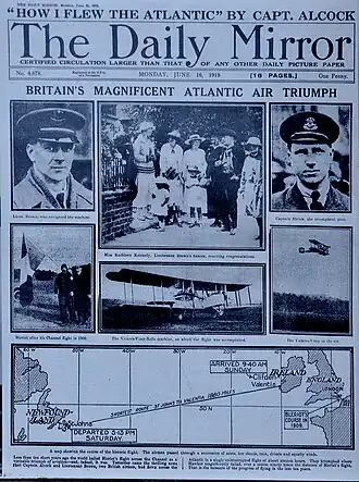 De Britse piloten Alcock en Brown maakten op 14 -15 juni 1919 de allereerste non-stop transatlantische vlucht. John Alcock en Arthur Brown vlogen met een aangepaste Vickers Vimy-bommenwerper uit de Eerste Wereldoorlog van St. John's (Newfoundland en Labrador), Canada, naar Clifden, County Galway, Ierland. De minister van Luchtvaart, Winston Churchill, overhandigde hen de Daily Mail-prijs voor de eerste oversteek van de Atlantische Oceaan per vliegtuig in minder dan 72 opeenvolgende uren. Een kleine hoeveelheid post werd op de vlucht vervoerd, waardoor het ook de eerste transatlantische luchtpostvlucht was. De twee vliegeniers werden een week later door koning George V in Windsor Castle onderscheiden met de Knight Commander of the Most Excellent Order of the British Empire.[1]